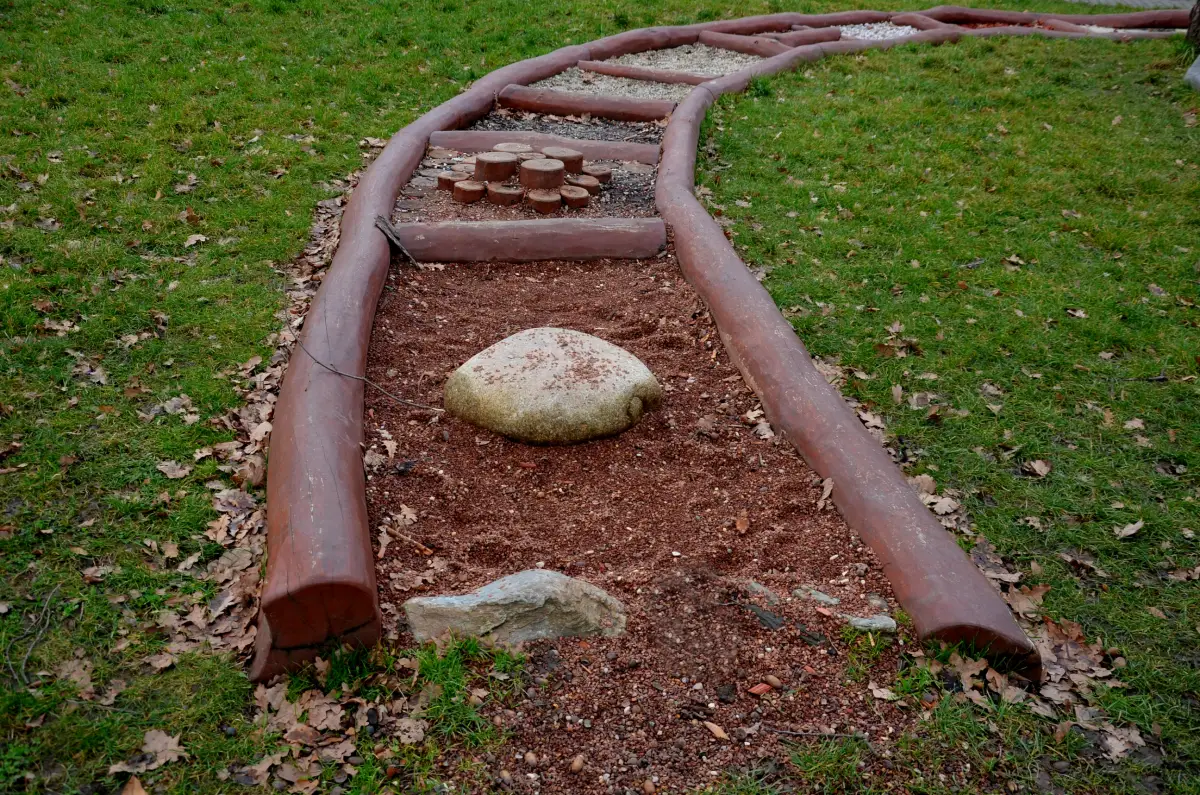 Damit der Pfad optisch besonders ansprechend aussieht, sollte er am besten eine Wegbegrenzung sowie Begrenzungen für die einzelnen Materialfelder erhalten. Besonders natürlich sehen dabei Materialien aus Holz (z.B. dünne Baumstämme) oder Stein (z.B. kleinere Feldsteine, Pflastersteine) aus.