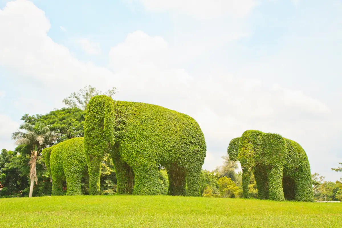 Solitär stehende Buchsbäume werden häufig in Form geschnitten. Wer sich einen gleichmäßigen Schnitt nicht zutraut, kann auch eine spezielle Buchsbaumschablone verwenden. Neben der standardmäßigen kugeligen Form sind damit auch außergewöhnliche Formen möglich.